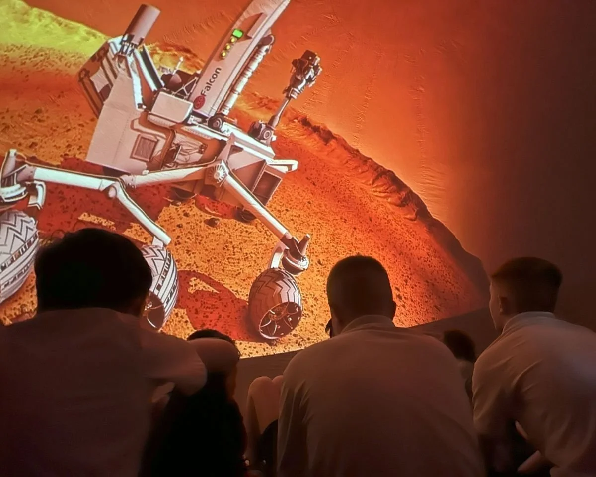 Three children in the Sensory Science Dome looking up at an image of the Mars rover.